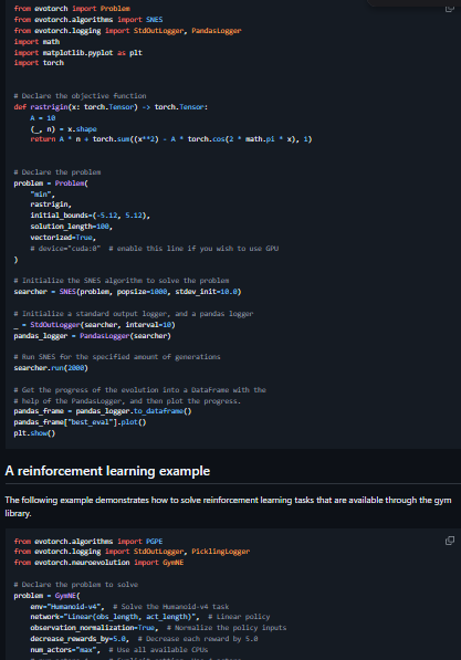 EvoTorch is an evolutionary optimization framework built on top of PyTorch, developed by NNAISENSE. It is designed for large-scale optimization problems, particularly those that require evolutionary algorithms rather than gradient-based methods.
