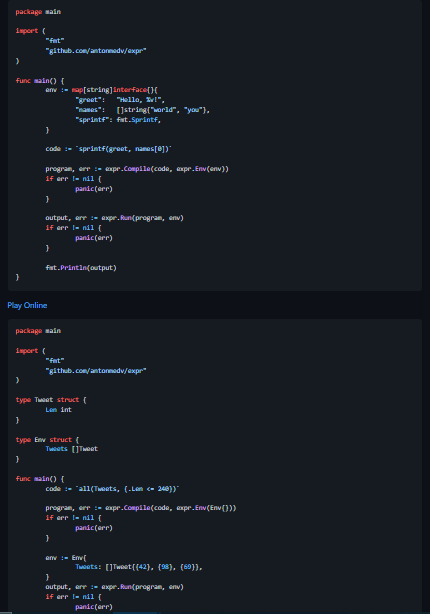 Expr package provides an engine that can compile and evaluate expressions. An expression is a one-liner that returns a value (mostly, but not limited to, booleans). It is designed for simplicity, speed and safety. The purpose of the package is to allow users to use expressions inside configuration for more complex logic. It is a perfect candidate for the foundation of a business rule engine. The idea is to let configure things in a dynamic way without recompile of a program.