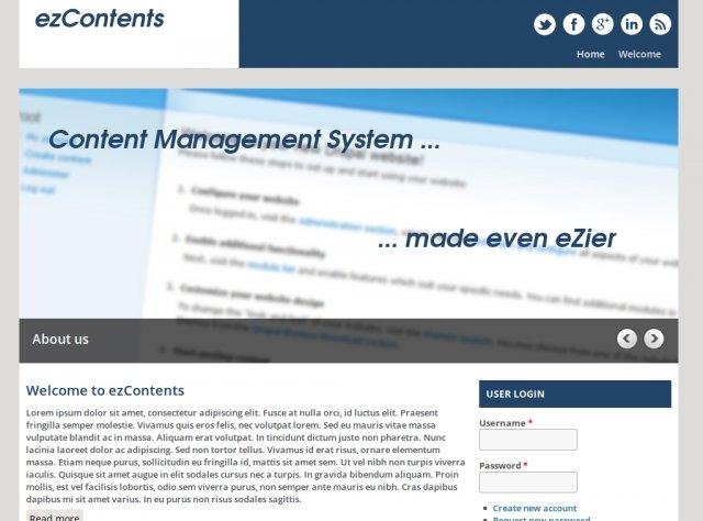 ezContents is a Web site content management system in the form of a Drupal distribution. The default theme is fully responsive. Its features include maintaining menus, adding authors that write contents, permissions, workflow, and layout possibilities for the entire look of the site by simple use of settings. A @font-your-face module with Google Web Fonts is added by default. It offers great flexibility for the Web site developer and a user-friendly interface for the editor. You can extend it yourself using existing Drupal modules or themes.