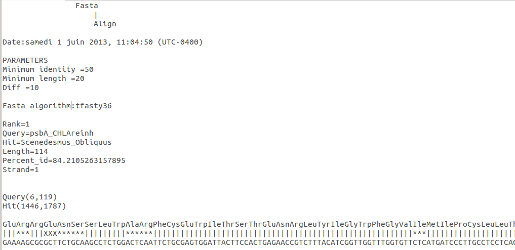 FastAlign.pl provides a more intuitive output to find exon-intron junctions. The query string is in amino acids and the hit string is in nucleotides. There are extra nucleotides at the end of the hit string (option -diff and by default = 10), that allow to verify if the intron start with common rules (5'-GTGCGA-... for group II intron and after an exonic T for group I intron).