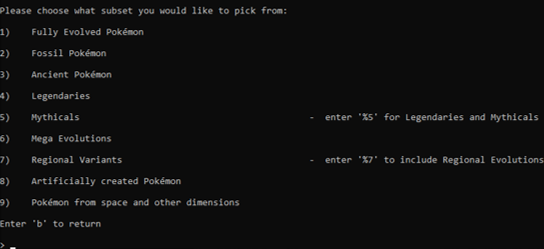 Pick your favourite Pokémon from a subcategory of your selection! You can sort by Generation or pick from one of many different subsets including Legendaries, Mythicals, Fossils and Fully Evolved.