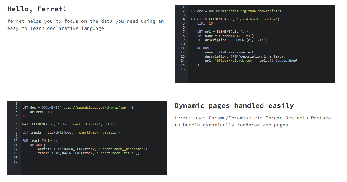 A web scraping system aiming to simplify data extraction from the web. ferret has a declarative query language that makes it easy to focus on the data that you need to get. ferret has the ability to scrape JS rendered pages, handle all page events, and emulate user interactions. the ferret was designed as a library from the ground up. it can be easily embedded into any Go application. ferret helps you to focus on the data you need using an easy-to-learn declarative language. ferret uses Chrome/Chromium via Chrome Devtools Protocol to handle dynamically rendered web pages. ferret is extremely extensible, and creating custom functions and types is super easy. ferret allows users to focus on the data. It abstracts away the technical details and complexity of underlying technologies using its own declarative language. It is extremely portable, extensible, and fast.