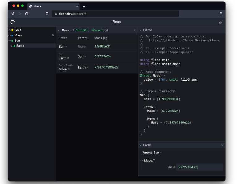 - A web-based dashboard (click to try!) for exploring entities, running queries & learning Flecs: