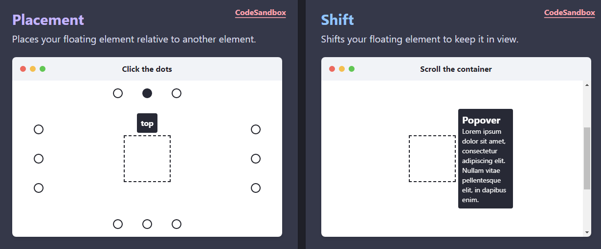 A JavaScript library for anchor positioning, anchor a floating element next to another element while making sure it stays in view optimally. This lets you position tooltips, popovers, or dropdowns to efficiently float on top of the UI! This positioning toolkit has a platform-agnostic 0.6 kB core (minified + Brotli compressed), with official bindings for the web, React DOM, React Native, and Vue. In addition to positioning, there are also interaction primitives to build floating UI components with React. This includes event hooks for hover, focus or click, modal and non-modal focus management, keyboard list navigation, typeahead, portals, backdrop overlays, screen reader support, and more. Floating elements are absolutely positioned, typically anchored to another UI element. Ensuring a floating element remains anchored next to another element can be challenging, especially in unique layout contexts like scrolling containers.