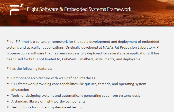 F´ (or F Prime) is a software framework for the rapid development and deployment of embedded systems and spaceflight applications. Originally developed at NASA’s Jet Propulsion Laboratory, F´ is open-source software that has been successfully deployed for several space applications. It has been used for but is not limited to, CubeSats, SmallSats, instruments, and deployable. Component architecture with well-defined interfaces. To develop applications with F´, the following requirements of the user’s system must be met, Linux or Mac OS X operating system (or Windows Subsystem for Linux on Windows), CMake, Bash or Bash compatible shell, Clang or GCC compiler, Python 3 and PIP. F´ can be quickly installed and ready to use by cloning the GitHub repository, installing Python code (typically in a virtual environment), and building one of our reference applications.