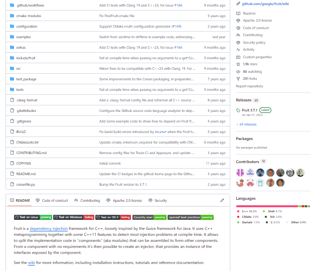 Fruit is a modern dependency-injection framework for C++ that brings type-safe, compile-time-checked wiring to large codebases. Instead of relying on runtime string keys or service locators, bindings are expressed with templates and policy objects that the compiler verifies. It supports constructor injection, assisted injection for factory patterns, scoping (singleton vs. per-request), and provider chains while keeping overhead minimal. Modules declare provided interfaces and requirements, and the injector ensures the whole graph is complete before you ship, eliminating many runtime surprises. Because bindings are ordinary C++ code, they integrate naturally with headers, visibility rules, and link-time optimization. Fruit’s design aims to deliver the ergonomics of DI frameworks from managed languages while staying faithful to C++ performance and compile-time guarantees.