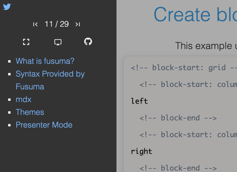 Fusuma is a tool that enables users to create slide presentations using Markdown. As someone who regularly creates slide presentations for work and personal projects, I find Fusuma to be a powerful and efficient tool that greatly simplifies the slide creation process. One of the main advantages of Fusuma is its ease of use. The tool is designed to work seamlessly with Markdown, a popular markup language used for formatting text. This means that users can quickly and easily create slides by writing content in Markdown, without needing to spend time formatting individual slides or worrying about design elements. Another great feature of Fusuma is its flexibility. The tool allows users to customize their slide presentations with a variety of design elements, including images, videos, and code snippets. This makes it easy to create visually appealing presentations that are both engaging and informative. Additionally, Fusuma integrates seamlessly with other tools and services, such as GitHub and Heroku. This makes it easy to share presentations with colleagues or clients, or even to host presentations online for broader audiences. Of course, like any tool, Fusuma has some limitations. It may not be suitable for complex slide presentations that require advanced design elements or animation effects. Additionally, users who are not familiar with Markdown may need to spend some time learning how to use the markup language effectively. Overall, I would highly recommend Fusuma to anyone looking for a simple, yet powerful tool for creating slide presentations using Markdown. With its ease of use, flexibility, and integration with other tools and services, Fusuma has become an essential tool in my workflow for creating visually appealing and informative slide presentations.