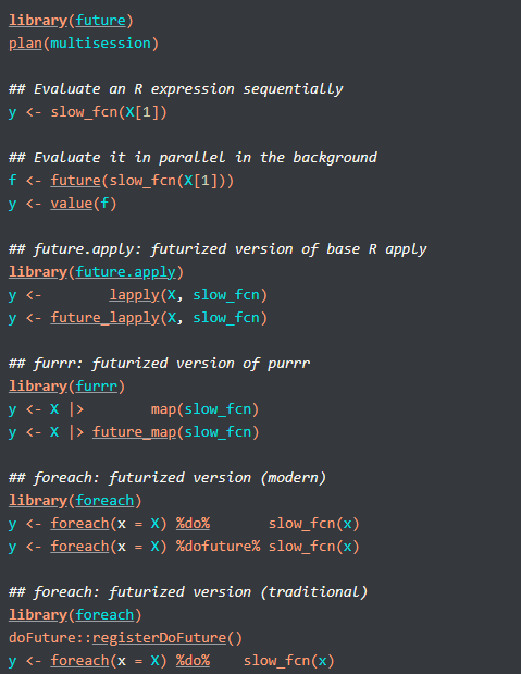 The future package in R provides a unified abstraction for asynchronous and/or parallel computation. It allows R expressions to be scheduled for future evaluation, with the result retrieved later, in a way decoupled from the specific backend used. This lets code be written in a way that works with sequential execution, multicore, multisession, cluster, or remote compute backends, without changing the high-level code. It handles automatic exporting of needed global variables/functions, managing of packages, RNG, etc. Automatic detection and export of global objects and functions needed by future expressions, so the user doesn’t need to manage that manually. Ability to control how futures are resolved.