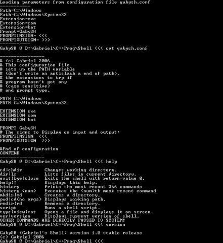 This program is a simple shell. chdir, echo, mkdir,rmdir,cat, history, variables, a little help, ... are supported. For more info see the changelog! There's also a script installer/uninstaller. (you can run it using GabySH!!!). Win32 Plateform.