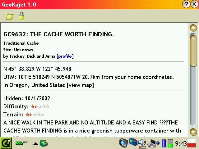 Paperless Geocaching application for Qtopia (Sharp Zaurus). GeoKajet displays cache descriptions downloaded from geocaching.com in a nice, one column format, suitable for a small PDA screen. It can also decode encrypted hints.