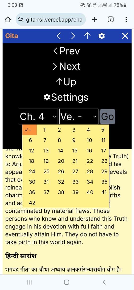 https://gita-rsi.vercel.app/ ( bit.ly/gitawebapp ), public GitHub repo: https://github.com/ravisiyer/gita , is a Bhagavad Gita web app (Next.js, open source, freeware) that I have developed which shows Gita verse text, transliteration and word meaning, along with translations and commentaries in English, Hindi and Sanskrit of famous recent spiritual masters from India like Swami Sivananda, Swami Chinmayananda, Swami Adidevananda and Swami Gambirananda. It also has Sanskrit commentaries of renowned ancient masters like Sri Shankaracharya, Sri Ramanujacharya and Sri Madhavacharya.