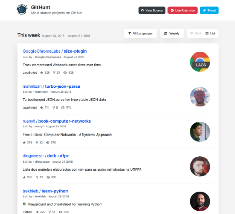 - GitHunt is an extension that replaces the new tab of your browser with the trending github repositories