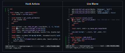 Super fast git decorations implemented purely in lua/teal. Signs for added, removed, and changed lines. Asynchronous using luv. Navigation between hunks. Stage hunks (with undo). Preview diffs of hunks (with word diff). Customizable (signs, highlights, mappings, etc). Status bar integration. Git blame a specific line using virtual text. Hunk text object. Automatically follow files moved in the index. Live intra-line word diff. Ability to display deleted/changed lines via virtual lines. Support for yadm. Support for detached working trees. If you are running a development version of Neovim (aka master), then breakage may occur if your build is behind latest. Gitsigns provides an on_attach callback which can be used to setup buffer mappings. This plugin is actively developed and by one of the most well regarded vim plugin developers. Gitsigns will only implement features of this plugin if: it is simple, or, the technologies leveraged by Gitsigns (LuaJIT, Libuv, Neovim's API, etc).