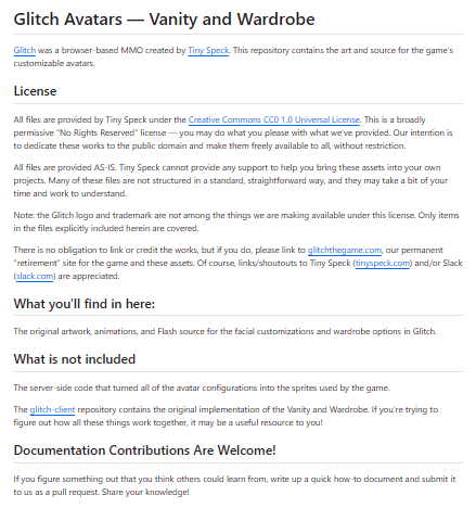 glitch-avatars is a collection of art assets, animation, and source code for the customizable avatar system used in the MMO game Glitch by Tiny Speck. It includes illustrations, animation frames, and data that describe avatar features, enabling avatars to be customized in clothing, appearance, and animations. It was released as part of Tiny Speck’s effort to preserve the game’s assets when the game shut down. The server-side code that turned all of the avatar configurations into the sprites used by the game. The glitch-client repository contains the original implementation of the Vanity and Wardrobe.
