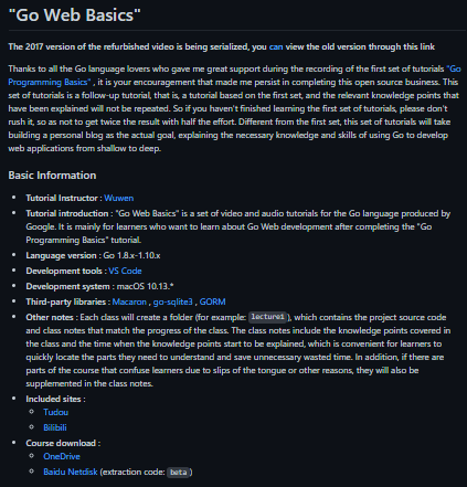 "Go Web Basics" is a set of audio and video tutorials for the Go language produced by Google. It is mainly for learners who want to learn more about Go Web development after completing the "Go Programming Basics" tutorial. "Go Web Basics" is a set of video and audio tutorials for the Go language produced by Google. It is mainly for learners who want to learn about Go Web development after completing the "Go Programming Basics" tutorial. Each class will create a folder (for example: lecture1), which contains the project source code and class notes that match the progress of the class. The class notes include the knowledge points covered in the class and the time when the knowledge points start to be explained, which is convenient for learners to quickly locate the parts they need to understand and save unnecessary wasted time. In addition, if there are parts of the course that confuse learners due to slips of the tongue or other reasons, they will also be supplemented in the notes.