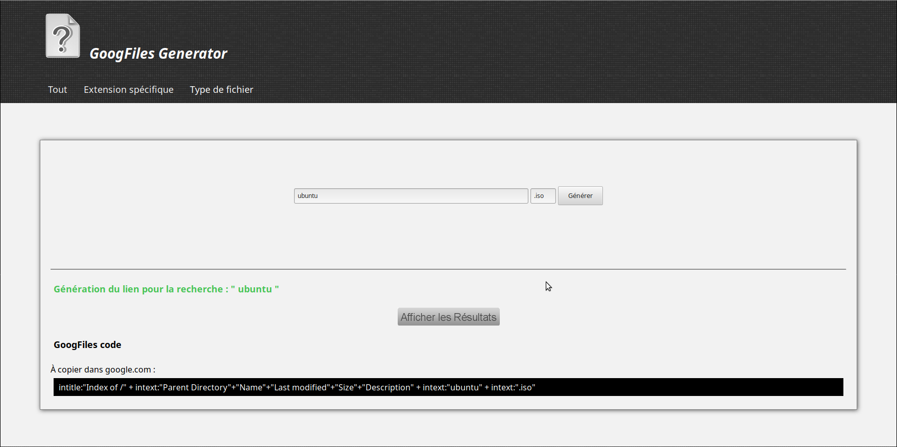Générateur de google dork pour trouver des fichiers avec Google. (Plus d'informations : https://fr.wikipedia.org/wiki/Google_hacking)