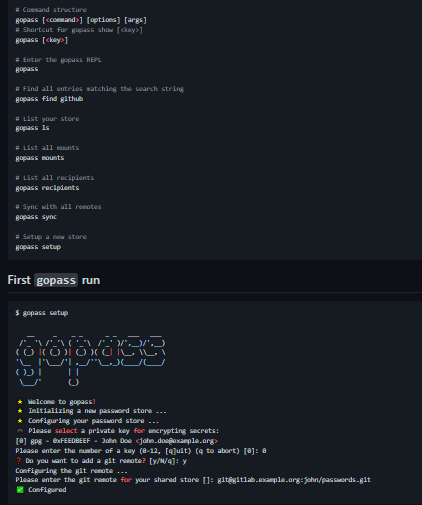 gopass is a simple but powerful password manager for your terminal. Manage your credentials with ease. In a globally distributed team, on multiple devices or fully offline on an air-gapped machine. By default your credentials are encrypted with GPG and versioned in git. This can be customized easily. The primary interface is the command line, making it an excellent choice for CLI fans, CI/CD systems or anything you can hook it up with. Gopass can also integrate with your browser so you can largely avoid the command line - if you want. gopass can operate without any dependencies but most users will use it with gpg and git. An external editor is required to use gopass edit. The same user experience on Linux, MacOS, *BSD or Windows. Built from our experience working in distributed development teams.