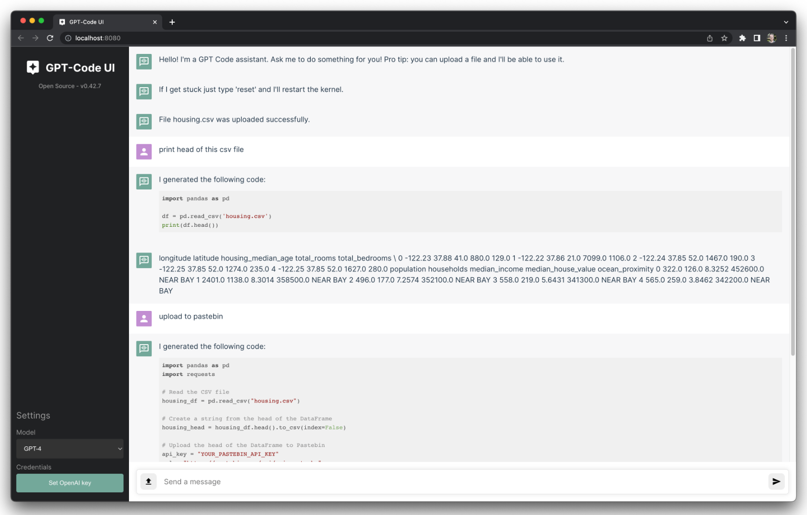 An open source implementation of OpenAI's ChatGPT Code interpreter. Simply ask the OpenAI model to do something and it will generate & execute the code for you. You can put a .env in the working directory to load the OPENAI_API_KEY environment variable. For Azure OpenAI Services, there are also other configurable variables like deployment name. See .env.azure-example for more information. Note that model selection on the UI is currently not supported for Azure OpenAI Services.