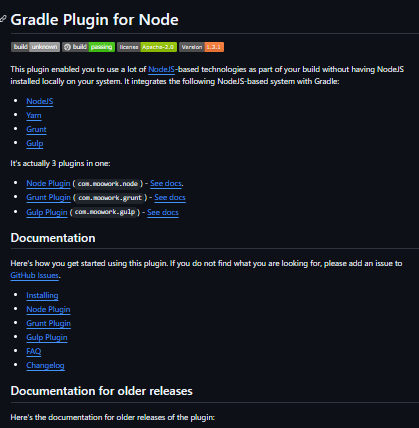 The gradle-node-plugin is a Gradle plugin that allows integration and execution of Node.js-based tools—such as Node.js itself, Yarn, Grunt, and Gulp—within your Gradle build, even if Node.js isn’t installed locally. It streamlines frontend build tasks by managing Node toolchain dependencies directly through Gradle. Installing the node-related plugins can be done in multiple ways. The easiest is to use the plugins-closure in your build.gradle file. If you want to install snapshot versions of this plugin, you can add the OJO repository to your build. Compatible with Gradle 6.6 and newer, Node.js 10+, and npm 7+.