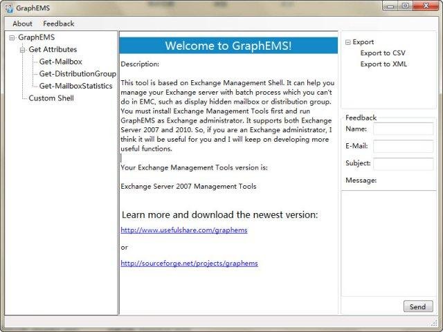 Graph EMS includes some common PowerShell commands, it can help the Exchange admistrator do the batch process to exchange server, such as display the hidden mailbox/distribution group and so on, must install Exchange Management Tool first.