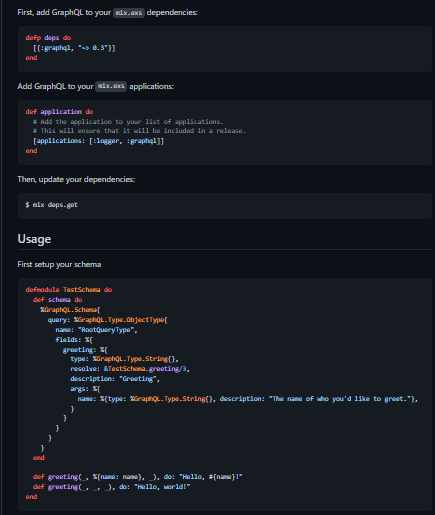 An Elixir implementation of Facebook's GraphQL. This is the core GraphQL query parsing and execution engine whose goal is to be transport, server and datastore agnostic. In order to setup an HTTP server (ie Phoenix) to handle GraphQL queries you will need plug_graphql. Examples for Phoenix can be found at hello_graphql_phoenix, so look here for a starting point for writing your own schemas. Other ways of handling queries will be added in due course. Tokenization is done with leex and parsing with yecc. Both very useful Erlang tools for parsing. Yecc in particular is used by Elixir itself.