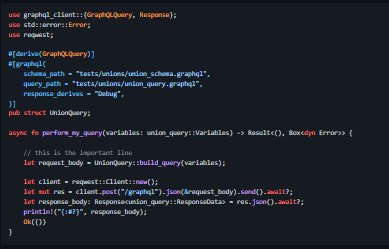 A typed GraphQL client library for Rust. Precise types for query variables and responses. Supports GraphQL fragments, objects, unions, inputs, enums, custom scalars and input objects. Works in the browser (WebAssembly). Subscriptions support (serialization-deserialization only at the moment). Copies documentation from the GraphQL schema to the generated Rust code. Arbitrary derives on the generated responses. Arbitrary custom scalars. Supports multiple operations per query document. Supports setting GraphQL fields as deprecated and having the Rust compiler check their use. Optional reqwest-based client for boilerplate-free API calls from browsers. Implicit and explicit null support.