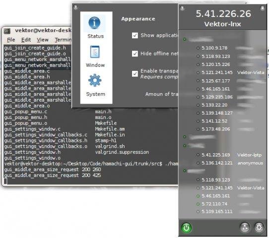 Hamachi-gui is a graphical front-end to Hamachi, a populare zero-configuration VPN client.