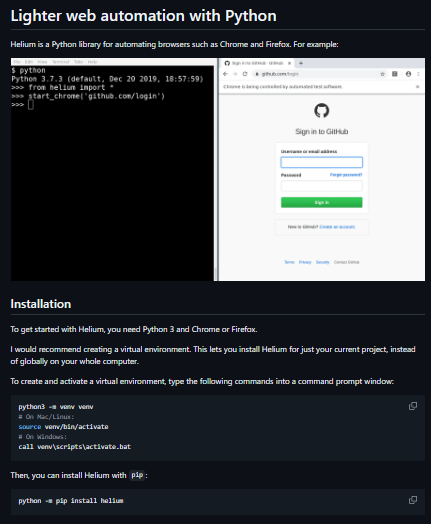 Helium is a Python library built on top of Selenium to make browser automation more intuitive and human-friendly. It replaces verbose boilerplate code with natural language-like API calls such as click("Login") or write("hello", into="Name"). Helium manages browser setup, waits, and teardown, enabling quick development of scripts for testing, scraping, or task automation without requiring deep Selenium knowledge.