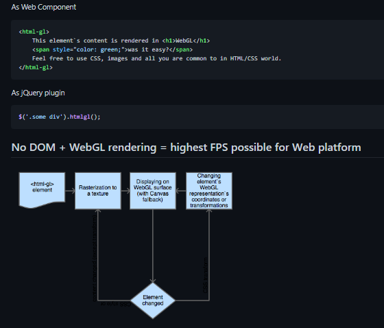 - HTML GL is framework agnostic and is easy to inject into existing project which needs performance tweaking