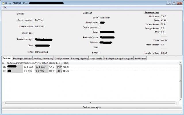 This is software for incasso (debtor collection agencies dutch) to create a dossier and to keep track of payments.