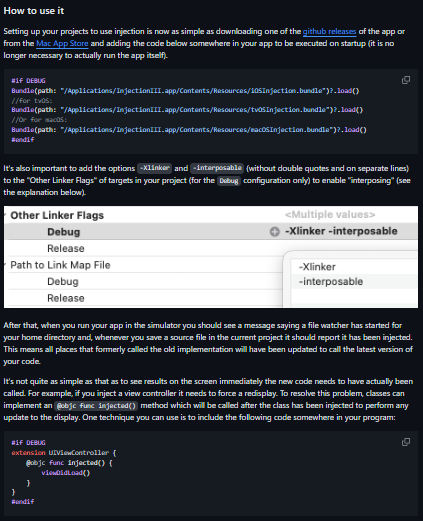 Code injection allows you to update the implementation of functions and any method of a class, struct or enum incrementally in the iOS simulator without having to perform a full rebuild or restart your application. This saves the developer a significant amount of time tweaking code or iterating over a design. Effectively it changes Xcode from being a "source editor" to being a "program editor" where source changes are not just saved to disk but into your running program directly.