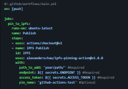 Pin your files to IPFS using GitHub Actions. This GitHub Action helps you to publish your website/assets to IPFS Pinning Services (e.g. Pinata or Firebase using the official IPFS Remote Pinning API. You can use this Action directly from your GitHub workflow. You can find the required credentials on your Pinning Services Website.