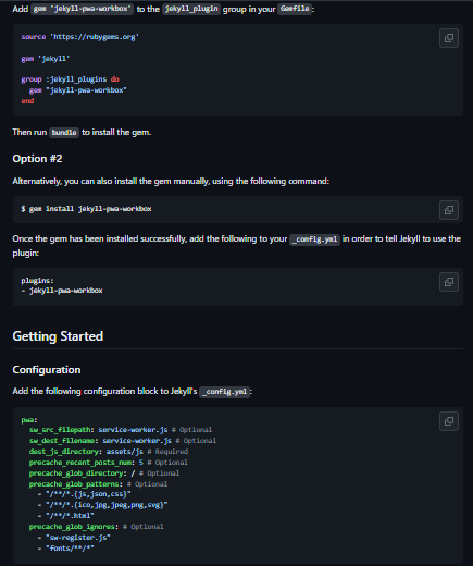 - We do not use npm and therefore integrate this function in the Jekyll build process to precache and make posts/pages available offline, even if they have never been visited before
