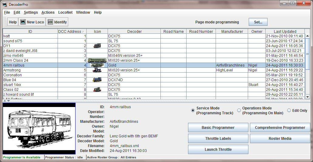 Java interfaces and sample implementations for controlling a model railroad layout from a personal computer. JMRI is intended as a jumping-off point for hobbyists to build their own layout controls. Includes the DecoderPro and PanelPro applications.