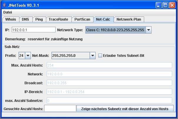 A network tool with gui for whois, ping, traceroute, ns lookup (dig, dns), portscan, network calculator, visual net plan - written in java.