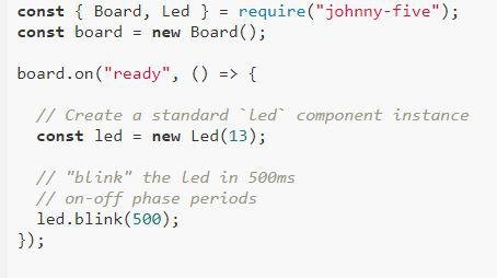 Johnny-Five is the JavaScript Robotics & IoT Platform. Released by Bocoup in 2012, Johnny-Five is maintained by a community of passionate software developers and hardware engineers. Over 75 developers have made contributions towards building a robust, extensible and composable ecosystem. The only kit designed for getting started with Johnny-Five! The Johnny-Five Inventor's Kit, from Bocoup and SparkFun, is now available! It's designed for anyone who wants to get started with JavaScript-powered robotics. The J5IK includes a Tessel 2, and everything else you need to do 14 experiments! No programming or soldering experience is required. Microcontrollers and SoC platforms like to say "Hello World" with a simple blinking LED; the following demonstrates how to do this with the Johnny-Five framework.