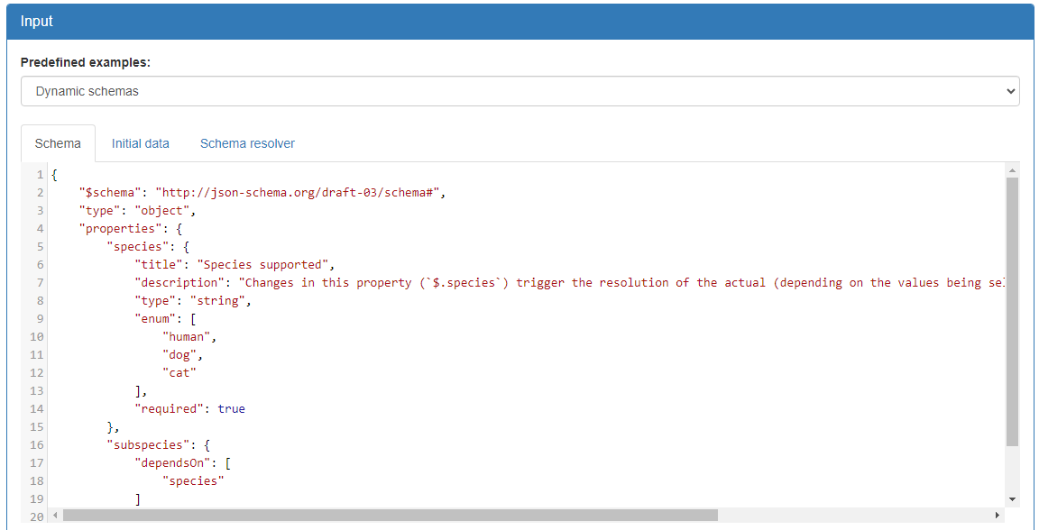 JSON Schema to HTML form generator, supporting dynamic subschemas (on-the-fly resolution). Extensible and customizable library with zero dependencies. Bootstrap add-ons provided. This library supports dynamic schemas, that is, subschemas that can change depending on the value of other parts of the data. This allows the creation of dynamic forms that vary their shape depending on the values entered by the user. This is extremely useful for big autogenerated schemas, that aggregate lots of subschemas and have functional bindings, given that it allows to show the user a simpler, non-error-prone form, also avoiding asking for unneeded data.