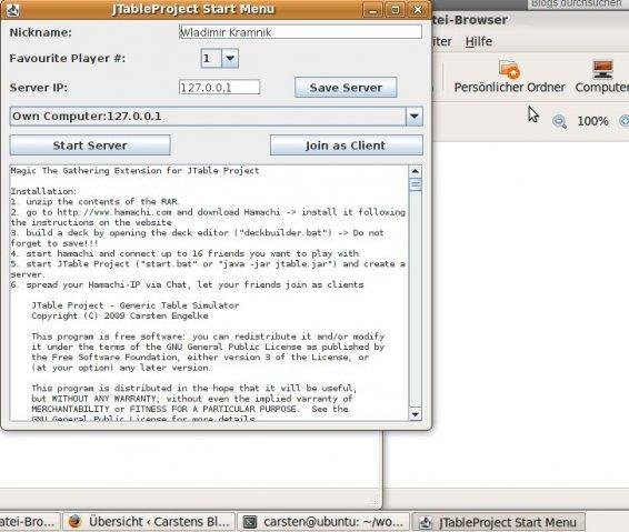 A table game simulator. You can play easy card games and even ccgs. JTable is a generic simulator. You can create up new games easily with the editor. Play every game you want with up to 12 players via internet (using Hamachi: http://www.hamachi.com) or