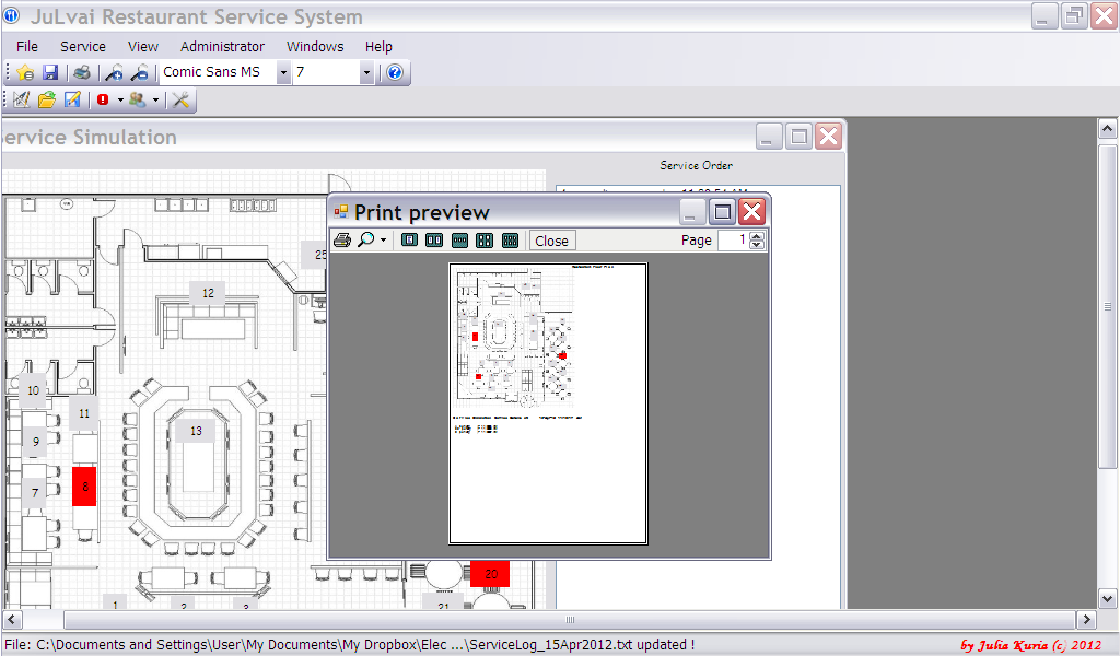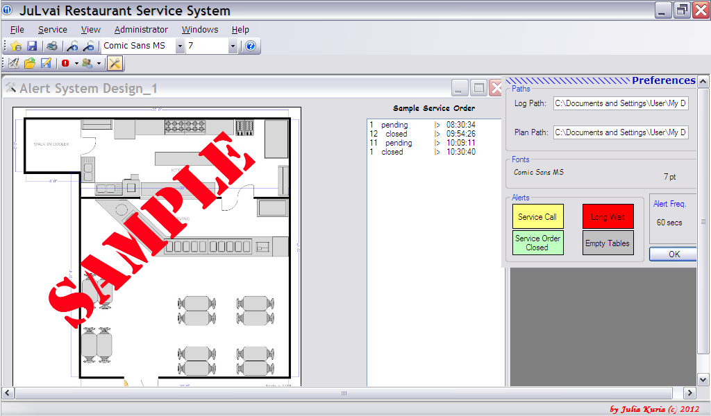 JuLvai Restaurant Service System captures alerts for service through serial communication. It also calls attention to tables who have not received service for a set minimum duration.