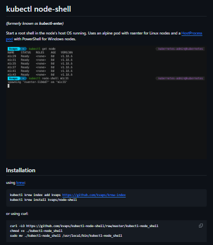 - Uses an alpine pod with nsenter for Linux nodes and a HostProcess pod with PowerShell for Windows nodes