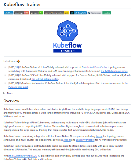 Kubeflow Trainer is a Kubernetes-native platform designed for scalable, distributed training and fine-tuning of machine learning models, particularly large language models, across multi-node and multi-GPU environments. It extends the Kubeflow ecosystem by providing a unified framework for orchestrating training workloads using Kubernetes primitives, enabling seamless scaling from single-machine experiments to large production clusters. The platform supports a wide range of machine learning frameworks, including PyTorch, JAX, Hugging Face, DeepSpeed, and XGBoost, making it highly flexible for different AI use cases. One of its key innovations is the integration of MPI-based distributed computing within Kubernetes, allowing efficient communication between nodes for high-performance training. It also includes advanced scheduling capabilities through integrations with tools like Kueue and Volcano, enabling topology-aware resource allocation and multi-cluster job orchestration.