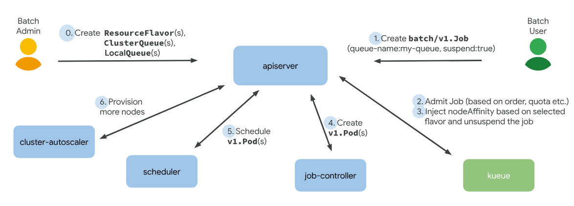 Kueue is a set of APIs and controllers for job queueing. It is a job-level manager that decides when a job should be admitted to start (as in pods can be created) and when it should stop (as in active pods should be deleted). Use Kueue to build a multi-tenant batch service with quotas and a hierarchy for sharing resources among teams in your organization. Based on the available quotas, Kueue decides when jobs should wait and when and where they should run. Kueue works in combination with standard kube-scheduler, cluster-autoscaler, and the rest of the Kubernetes ecosystem. This combination allows Kueue to run both on-prem and in the cloud, where resources can be heterogeneous, fungible, and dynamically provisioned.