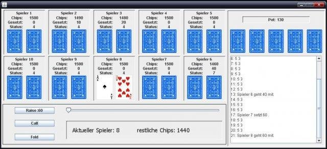 Texas Hold'em Poker Ziele: - Client um zu Server zu verbinden - Server um Verbindungen, Spielablauf und Computerspieler zu verwalten - verschiedene Pokerbots ( /KI-Strategien ) gegeneinander antreten lassen