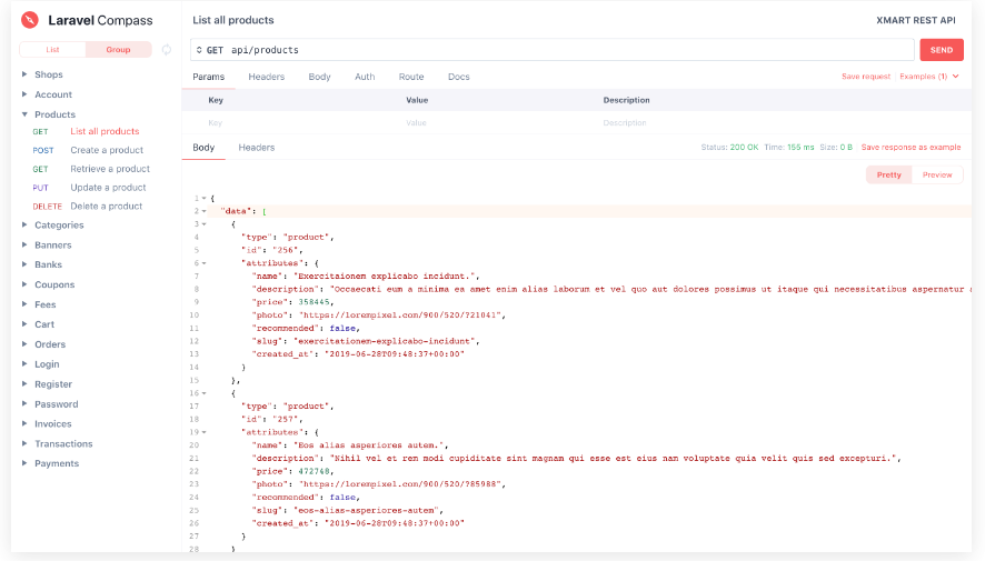 Laravel Compass is an elegant REST assistant for the Laravel framework that you can use to test API calls and create API documentation. it provides automatically endpoints for GET, POST, PUT/PATCH, DELETE, various auth mechanisms and other utility endpoints based on Laravel routes in your project.