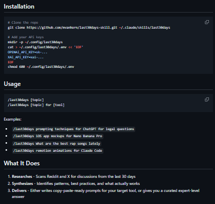 /last30days is a specialized Claude Code skill designed to research current trends and practices across Reddit, X, and the wider web from the last 30 days, synthesize that data, and produce copy-paste-ready prompts or summaries that reflect what the community is actually talking about now. Rather than returning generic model responses, it intelligently analyzes social media and community discussions to identify what’s genuinely trending or working in practice across topics ranging from prompt techniques to tool usage or cultural trends. This makes it particularly useful for prompt engineers, content creators, and developers who want up-to-date prompts and insights that align with the most recent consensus and shared best practices in fast-moving fields like AI tooling.
