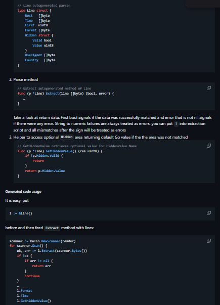 - Generates Go code for custom log file parsers