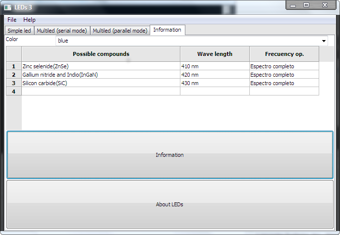 Este pequeño programa calcula la resistencia que debe ir asociada a cada diodo led, también suministra algo de información adicional