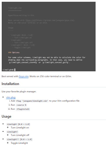 limelight.vim is a minimalist plugin that enhances focus by subtly dimming all but the paragraph or block surrounding the cursor. It’s designed to complement distraction-free modes such as goyo.vim, helping writers and coders keep attention on their current context. The plugin adjusts highlight groups dynamically so the active text remains clear while surrounding text fades into a low-contrast tone. It supports fine-grained control over opacity and integrates with any colorscheme without breaking syntax highlighting. Because it’s lightweight and entirely written in Vimscript, it runs smoothly even on large files. The visual effect creates a calm, spotlight-like environment that reduces visual clutter while editing prose, code comments, or long documentation files.