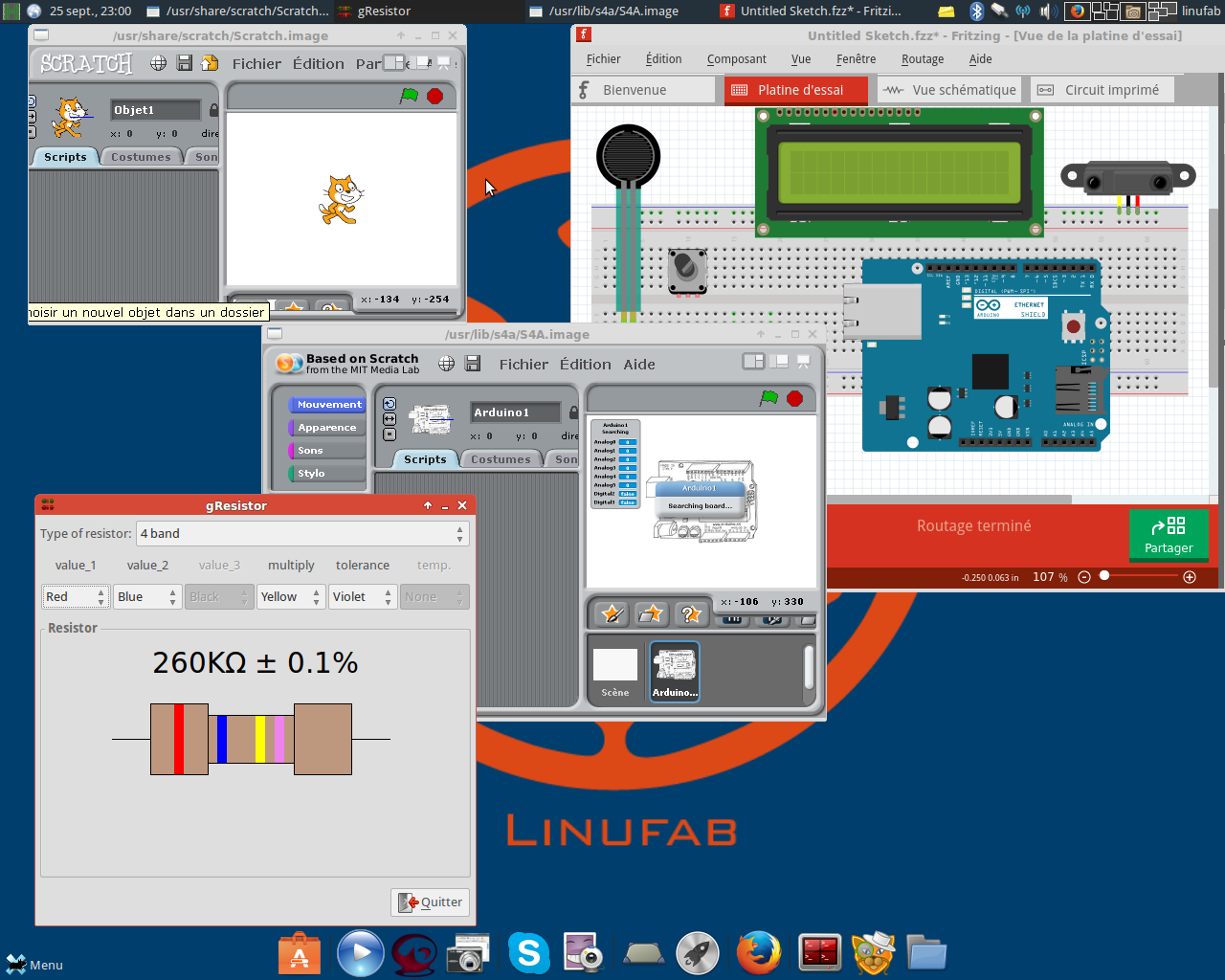 Pour les logiciels on retrouvera en autre, blender, freecad, librecad, visual_fsm, meshmixer, makerware, makehuman, arduino, fritzing et beaucoup d'autres logiciels à découvrir.