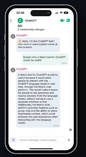 Matrix ChatGPT Bot allows you to talk to ChatGPT via any Matrix client. OpenAI released the official API for ChatGPT. Thus, we no longer have to use any older models or any models which kept on being turned off by OpenAI. This means the bot is now way more stable and way faster. However, please note: The usage of the API is no longer free. If you use this bot, your OpenAI account will be charged! You might want to limit your budget in your account using the OpenAI website. You need to remove the CHATGPT_MODEL variable from your environment, if you changed the value. Create a room, add the bot, andtart chatting. You need to have an account at openai. Please note that the usage of the ChatGPT-API is not free.